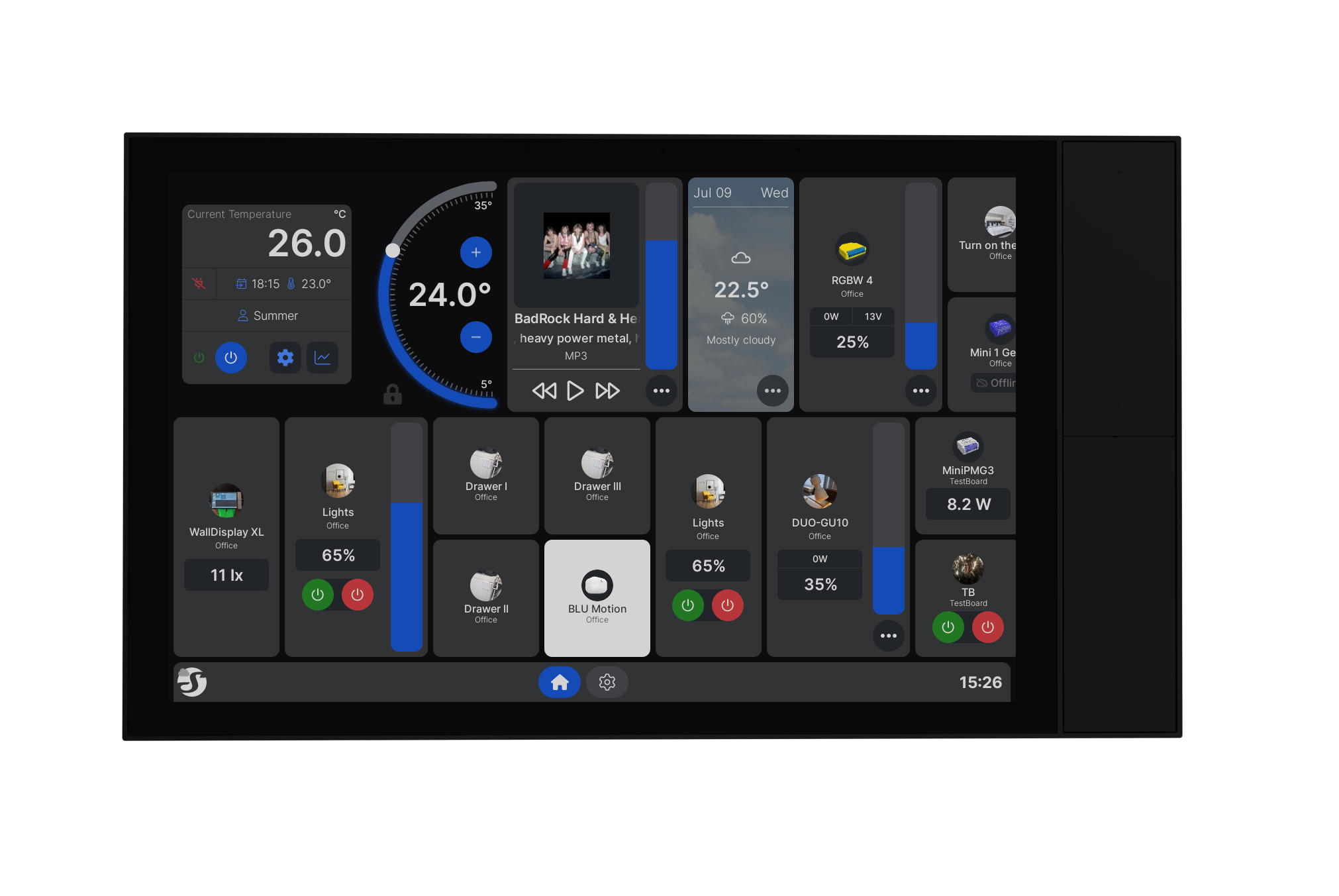 Elegantní černý nástěnný panel s 10,1″ dotykovým displejem, integrovaným relé, reproduktory, světelným senzorem a čtyřmi konfigurovatelnými tlačítky. Kompletní řízení domácnosti z jednoho místa.