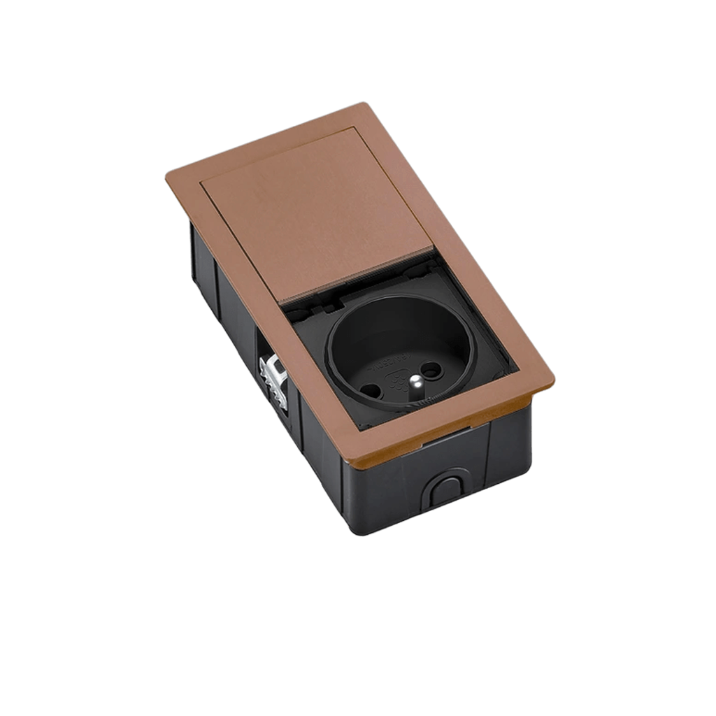 Tělo jednotky je vyrobeno z odolného technopolymeru, zatímco rámeček a ochranný kryt jsou ze zinkové slitiny Zamak, která zajišťuje pevnost, dlouhou životnost a prémiový vzhled v odstínu bronzová. Unikátní systém posuvného krytu umožňuje odkrýt zásuvku pouze tehdy, když ji právě potřebujete, zatímco v nečinnosti zůstává skrytá a chráněná. Tento produkt kombinuje kompaktní rozměry a vysokou odolnost.