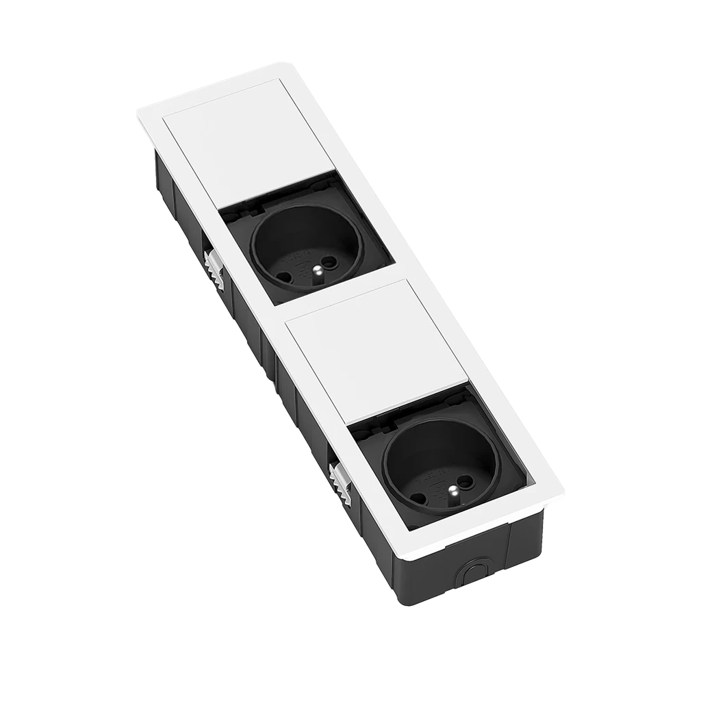 Jednotka je vybavena 2x elektrickou zásuvkou 230 V pro pohodlné napájení spotřebičů. Zásuvka splňuje v zavřeném stavu krytí IP54, což zajišťuje ochranu proti vniknutí prachu a stříkající vody a umožňuje bezpečné použití na kuchyňských ostrůvcích i pracovních deskách.