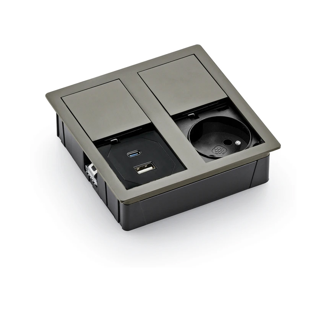 Jednotka je vybavena 1x elektrickou zásuvkou 230 V a duální USB nabíječkou (USB-A + USB-C) pro pohodlné napájení a nabíjení moderních zařízení. Zásuvka splňuje v zavřeném stavu krytí IP54, což zajišťuje ochranu proti vniknutí prachu a stříkající vody a umožňuje bezpečné použití na kuchyňských ostrůvcích i pracovních deskách.