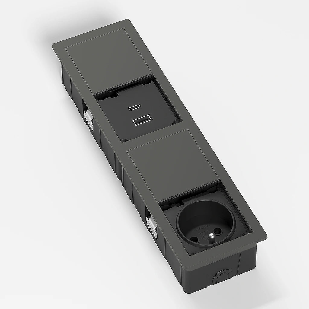 Jednotka je vybavena 1x elektrickou zásuvkou 230 V a duální USB nabíječkou (USB-A + USB-C) pro pohodlné napájení a nabíjení moderních zařízení. Zásuvka splňuje v zavřeném stavu krytí IP54, což zajišťuje ochranu proti vniknutí prachu a stříkající vody a umožňuje bezpečné použití na kuchyňských ostrůvcích i pracovních deskách.