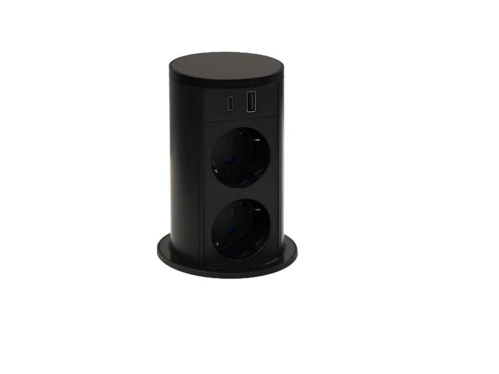 Výsuvný zásuvkový sloupek VersaLift nabízí 2 elektrické zásuvky a USB nabíječku A+C, takže lze pohodlně připojit elektrická zařízení i nabíjet mobilní přístroje přímo na pracovní ploše. Díky krytí IP54 (v zavřeném stavu) je chráněn proti prachu a stříkající vodě – ideální i do vlhkých či prašných prostředí, například kuchyní.