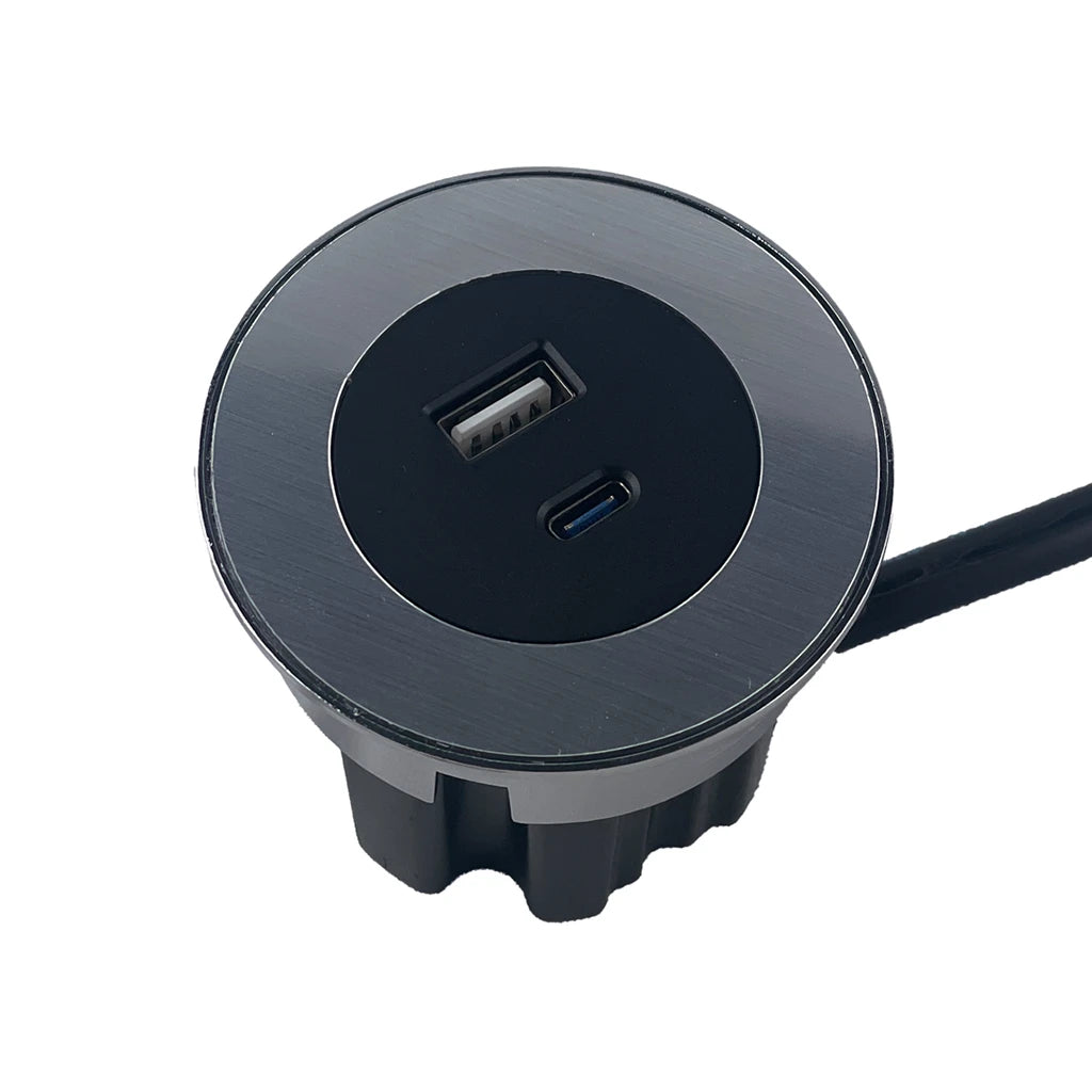 V této konfiguraci je VersaDot osazen moderními porty USB-A a USB-C, které sdílejí nabíjecí výkon 12 W. Toto řešení umožňuje pohodlné a efektivní napájení telefonů a tabletů přímo na pracovní ploše bez nutnosti použití externích adaptérů. Pro maximální flexibilitu a rychlost montáže je jednotka vybavena 0,5m kabelem se systémovým konektorem GST, který zajišťuje bezpečné propojení v režimu Plug & Play.