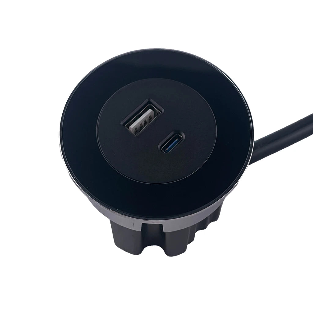 V této konfiguraci je VersaDot osazen moderními porty USB-A a USB-C, které sdílejí nabíjecí výkon 12 W. Toto řešení umožňuje pohodlné a efektivní napájení telefonů a tabletů přímo na pracovní ploše bez nutnosti použití externích adaptérů. Pro maximální flexibilitu a rychlost montáže je jednotka vybavena 0,5m kabelem se systémovým konektorem GST, který zajišťuje bezpečné propojení v režimu Plug & Play.