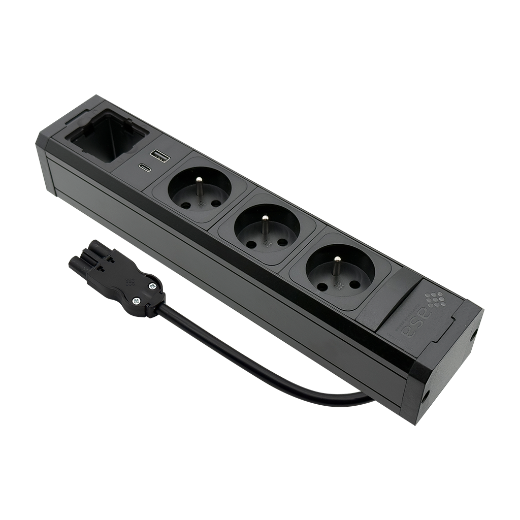 Versatek vyniká svou všestranností a konektivitou. Systém je plně konfigurovatelný a umožňuje kombinovat standardní zásuvky s výkonnými nabíjecími USB porty a volnými pozicemi pro moduly Keystone. Do těchto pozic lze snadno osadit konektory pro přenos dat a multimédií, jako jsou RJ45 nebo HDMI, přesně podle specifických potřeb uživatele. Přívod energie zajišťuje profesionální systém konektorů GST.
